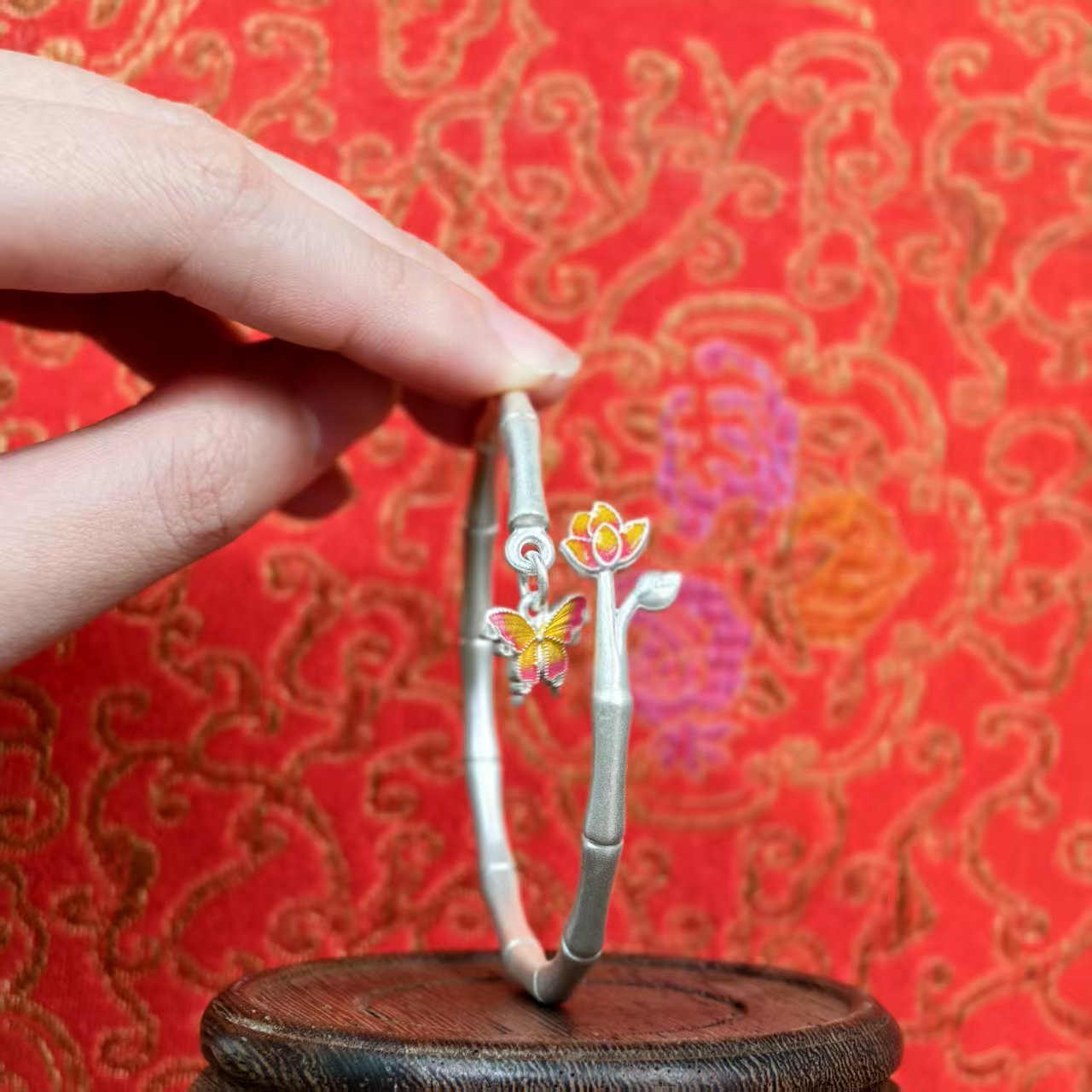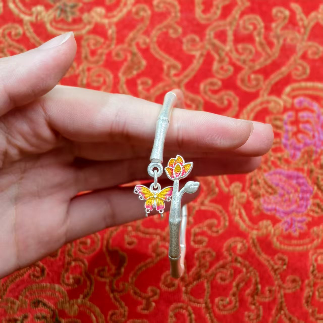 Luxury Bamboo-Knot Butterfly Flower Bracelet Fine Silver Traditional-Style Bangle Elegant Gift for Special Occasions | POD Customizable