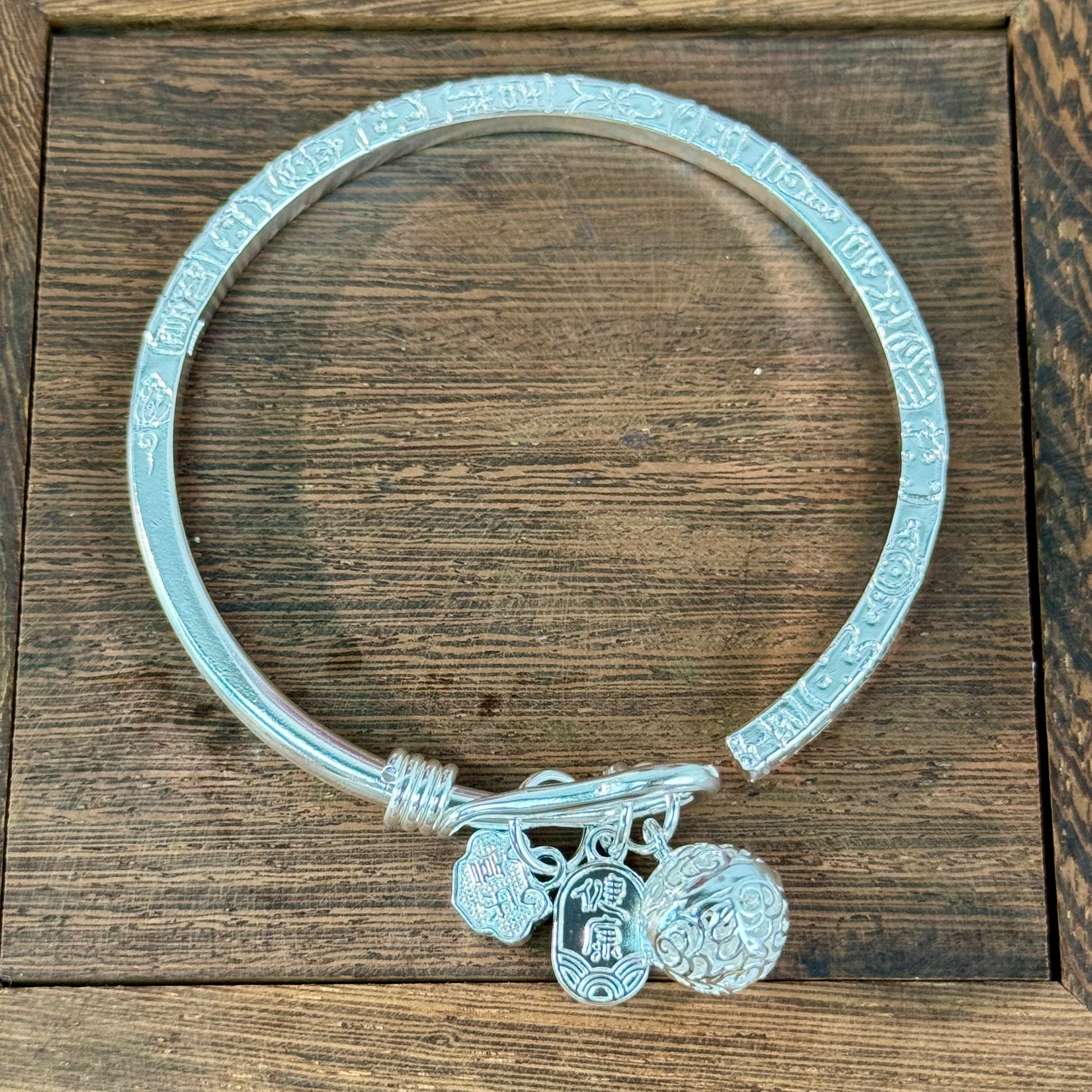 Pure Silver Bell & Pattern "Good Fortune & Bliss" Bangle – Luck Woven in Patterns, Blessings in Bell Chimes | POD Customizable