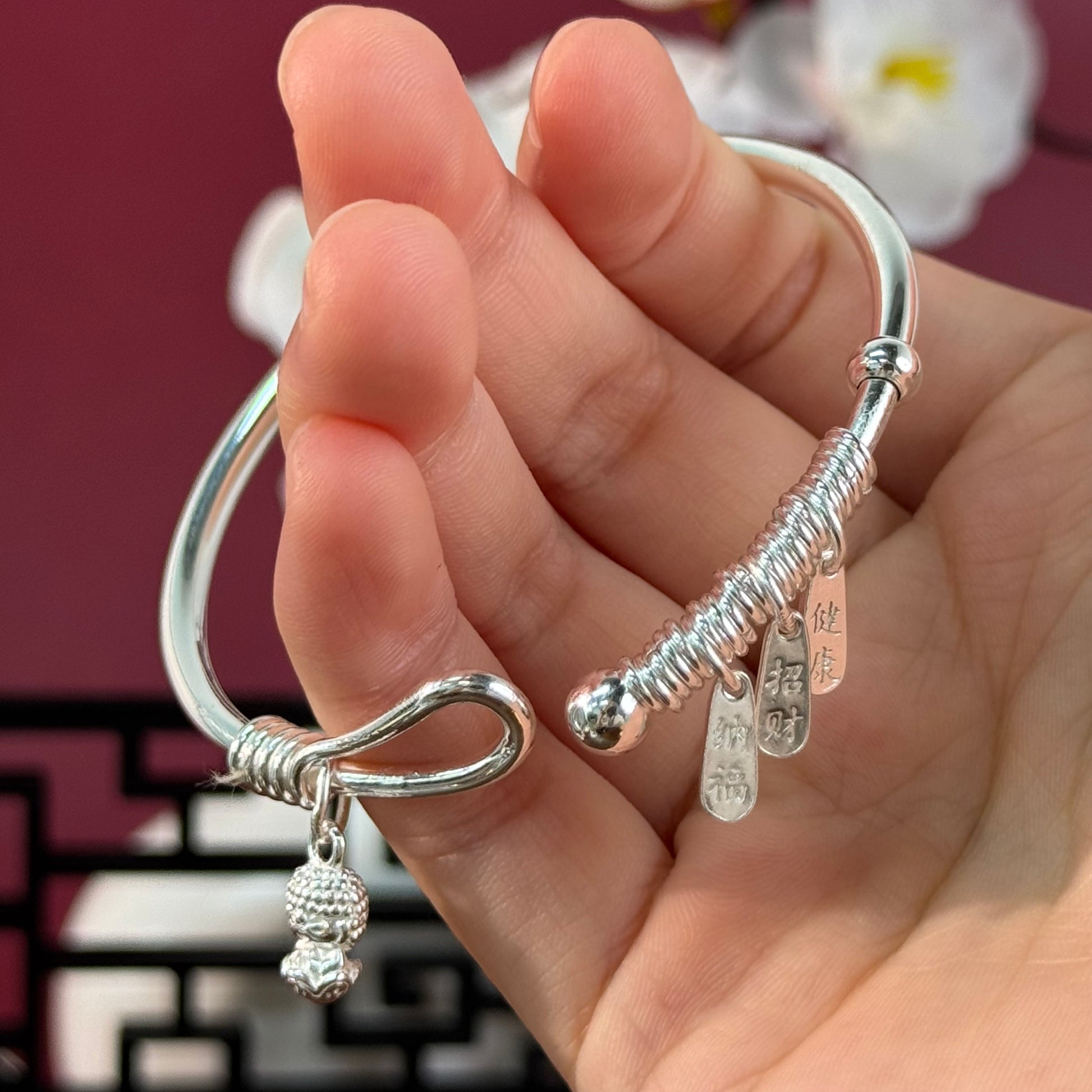 Pure Silver Braided Wire Pendant Bangle – Lucky Charms on Wrist, Delicate & Blessed | POD Customizable