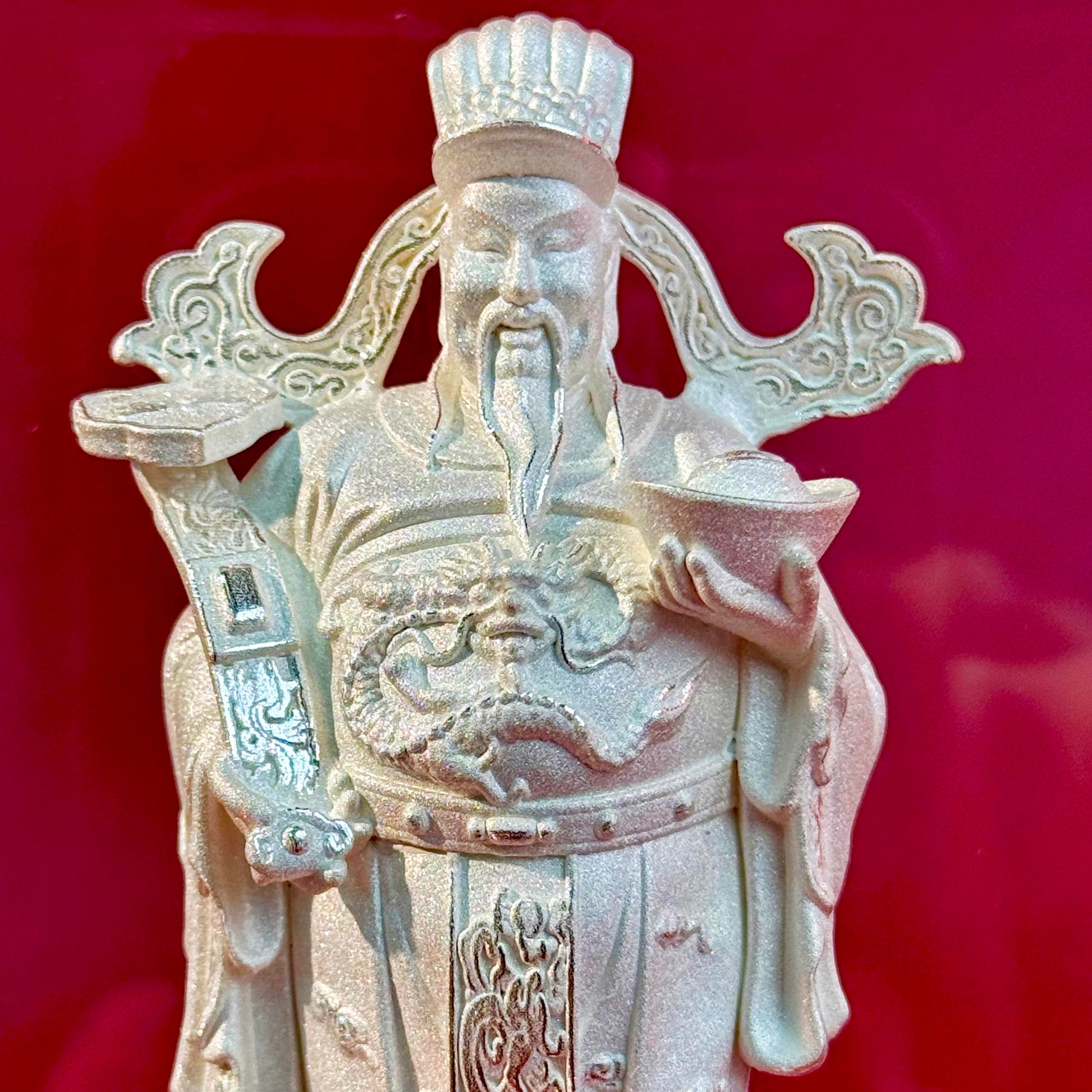 Exquisite Silver Craftsmanship, Full of God of Wealth’s CharmMade of high-purity silver, the details of the God of Wealth’s crown, long beard, clothing patterns, and the held gold ingot & ruyi are delicately carved in 3D. The silver has a warm natural luster – when displayed, the God of Wealth’s solemn yet approachable demeanor instantly creates an atmosphere of "welcoming wealth and blessings".