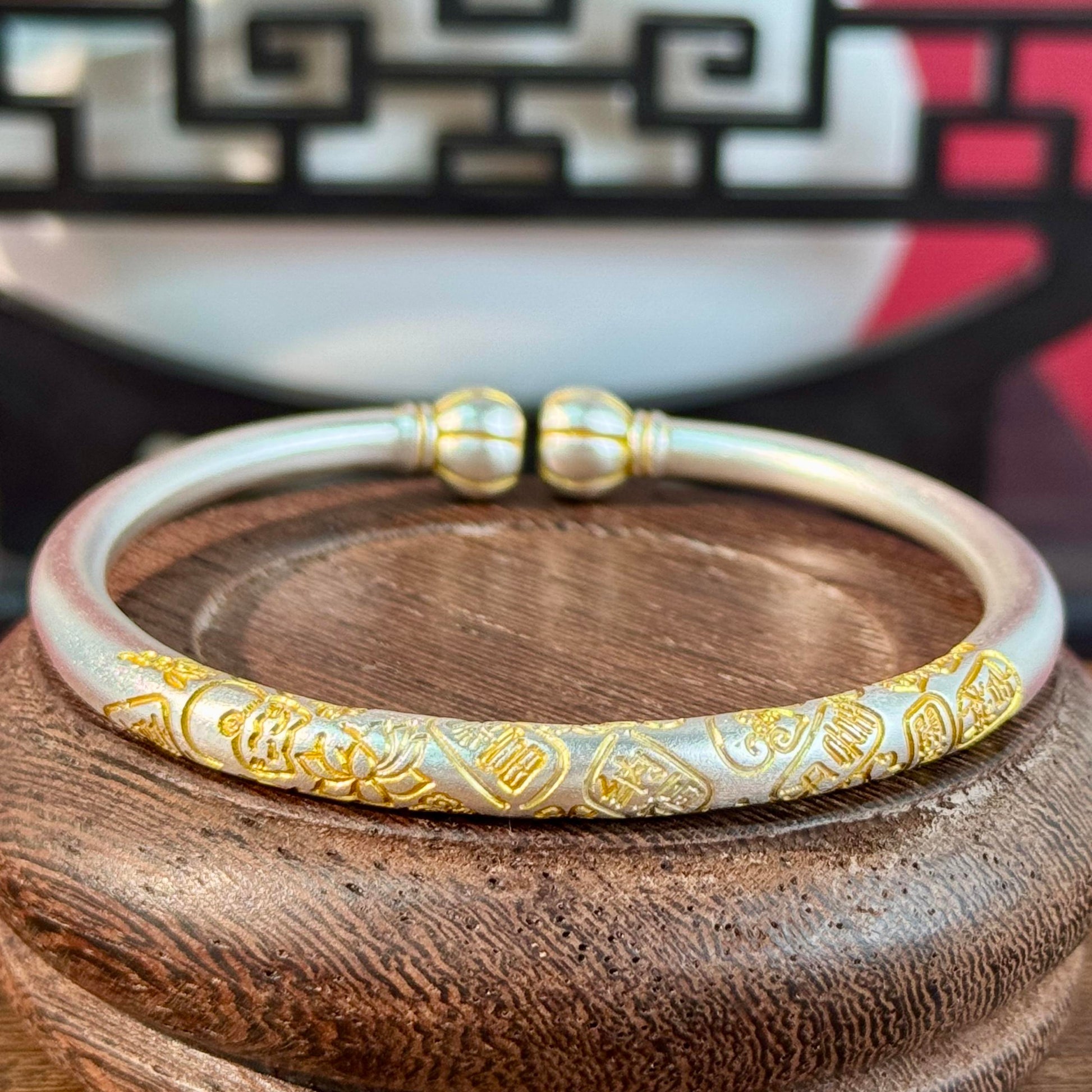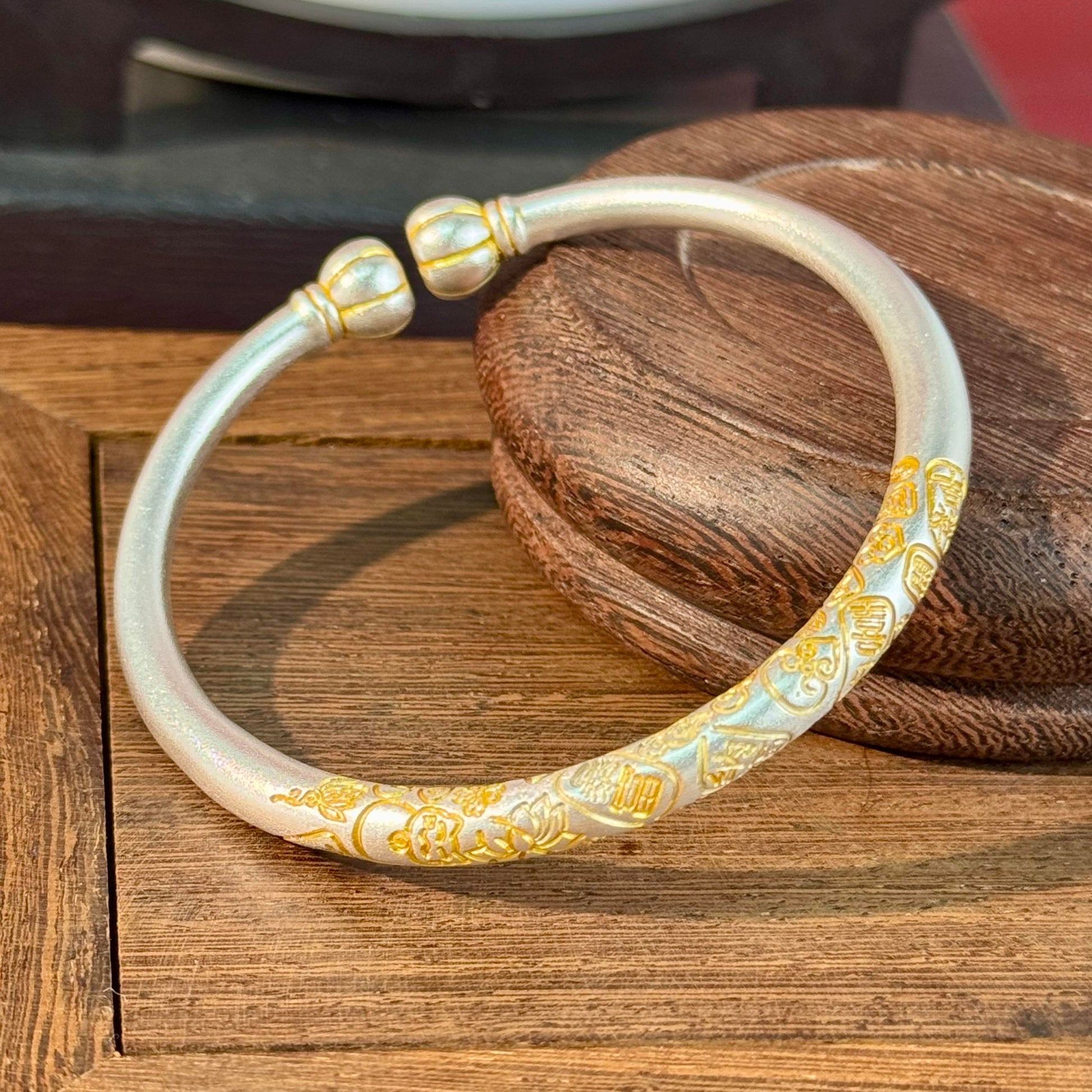 Silver Base with Gold Tracing, Hundred Blessings & Lotus Patterns Exude EleganceThe bangle uses a matte silver base, with gold tracing outlining "blessing" characters and lotus patterns. The tenderness of silver sets off the sophistication of gold; every texture hides the wish of "plenty of blessings, lotus blooms for well-being" – it’s both an accessory and a blessing on your wrist.