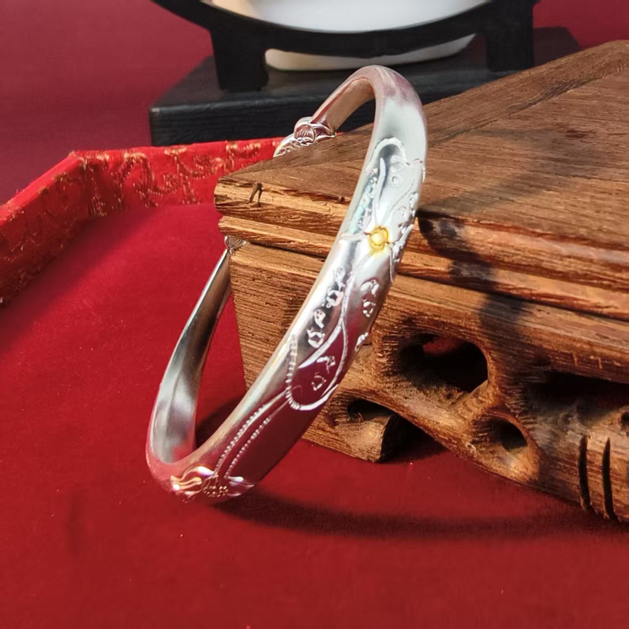 Solid Silver Ancient Craft Carved Lotus Bracelet – Tuck the Fragrance of Jiangnan Lotus into Wrist Gentleness | POD Customizable